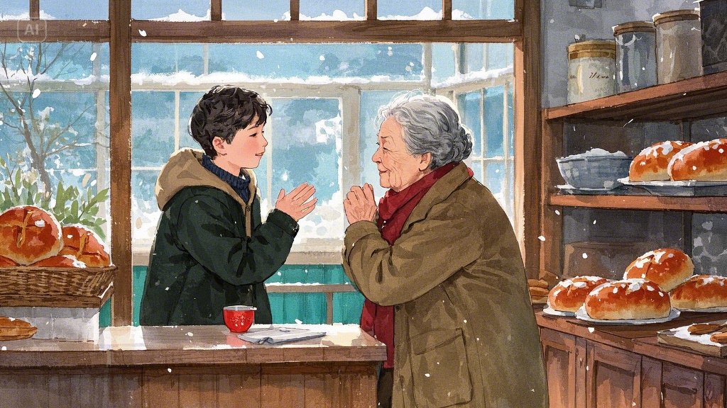 어느 겨울, 첫눈이 소복하게 내리던 날이었다. 할머니는 평소처럼 새벽부터 빵을 굽고 있었다. 창밖에는 하얀 눈이 펑펑 쏟아지고, 빵집 안은 따뜻한 온기와 달콤한 빵 냄새로 가득했다. 라디오에서는 잔잔한 캐럴이 흘러나왔다. 문득, 오래전 세상을 떠난 남편이 사무치게 그리워졌다.