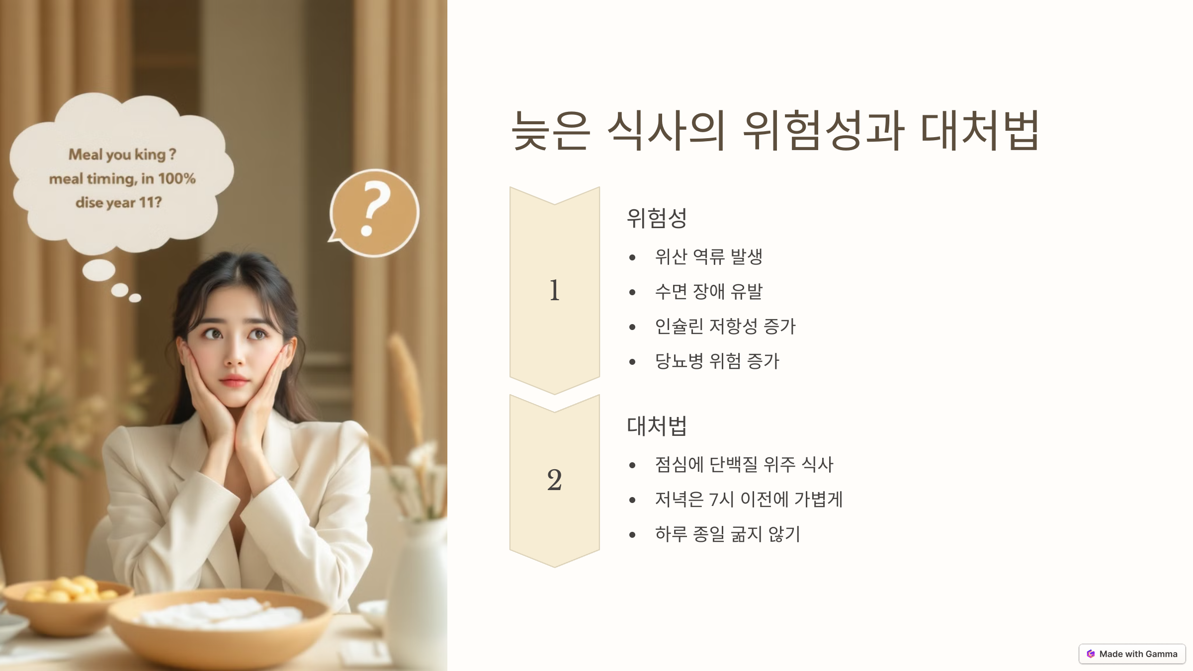 요즘 바쁜 일상 때문에 저녁 9시 이후에야 첫 끼를 먹는 분들 많으시죠? 하지만 늦은 식사는 단순히 살이 찌는 걸 넘어서 여러 가지 건강 문제를 일으킬 수 있어요. 소화가 덜 된 상태에서 잠자리에 들면 위산 역류나 수면 장애로도 이어질 수 있고, 특히 인슐린 저항성이 높아지기 쉬워 당뇨병 위험도 커진답니다.