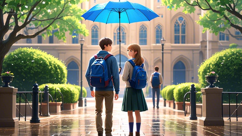 여학생은 조심스럽게 파란 우산 속으로 들어왔다.