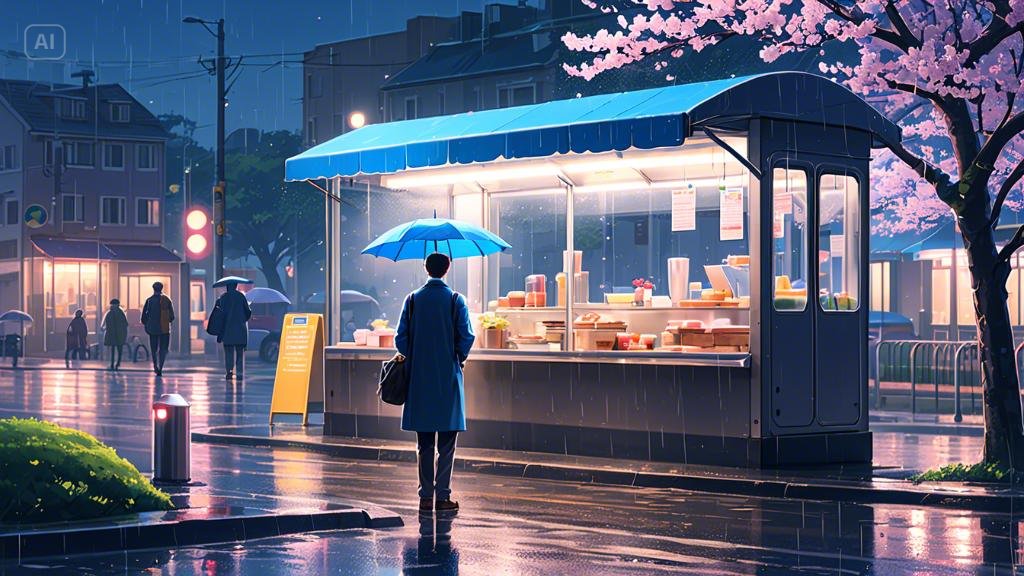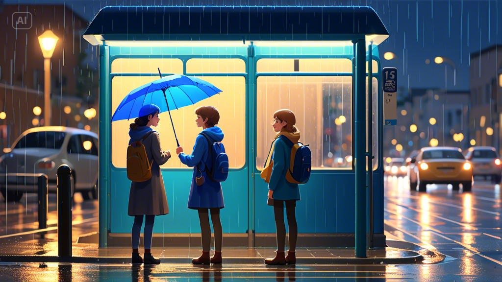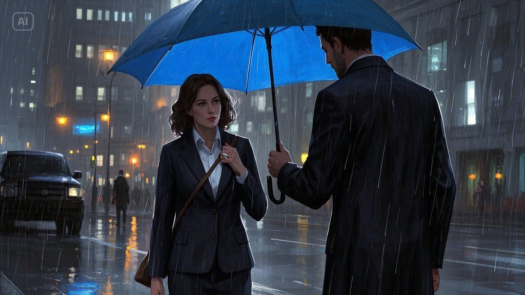 카페 아르바이트를 마치고 밤늦게 집으로 돌아가는 길이었다. 쏟아지는 장대비에 우산도 없이 꼼짝없이 발이 묶여 버렸다. 버스 정류장 처마 밑에서 비가 잦아들기만을 기다렸지만, 빗줄기는 더욱 거세질 뿐이었다. 발만 동동 구르며 어찌할 바를 모르고 있을 때, 파란 우산이 시야에 들어왔다.