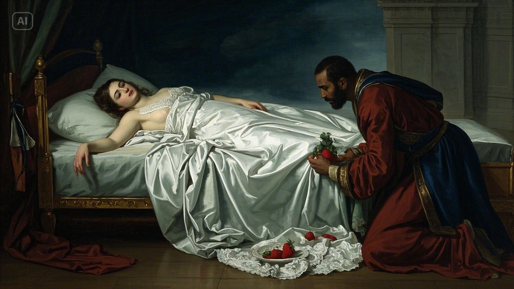 이아고는 교묘한 말과 조작된 증거(데스데모나의 손수건 등)를 이용해 오셀로의 마음속에 아내 데스데모나와 부관 카시오가 불륜 관계라는 의심을 심습니다. 순수하고 강직했던 오셀로는 점차 질투심에 사로잡혀 이성을 잃고, 결국 자신의 손으로 사랑하는 아내 데스데모나를 목 졸라 살해합니다.