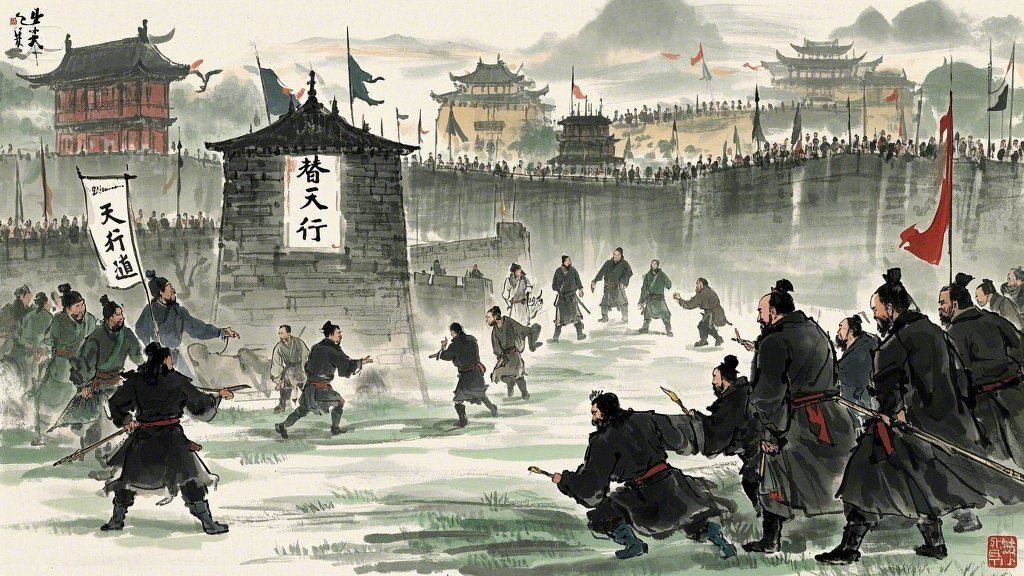 - 의미: "하늘을 대신하여 도를 행한다"는 뜻으로, 양산박 호걸들의 핵심적인 기치이자 명분입니다. 부패한 지상 권력을 부정하고, 하늘의 정의를 자신들이 직접 실현하겠다는 강력한 의지를 보여줍니다. 이는 단순한 반란이 아닌, 정의 구현을 위한 거사임을 강조하는 상징적인 구호입니다.