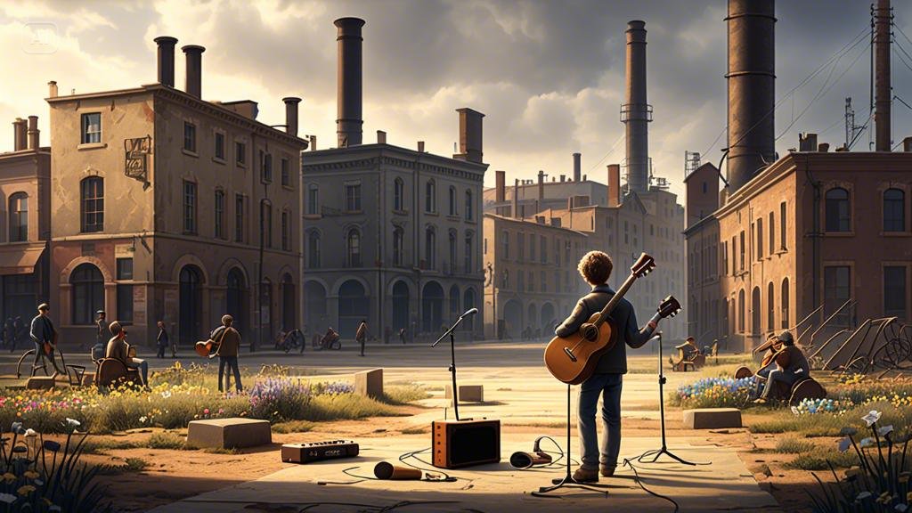 그런 도시에 한 남자가 흘러 들어왔다. 그의 이름은 루민, 어깨에는 닳고 닳은 기타 케이스 하나가 전부였다. 그는 정처 없이 떠도는 음악가였다. 왜 하필이면 이 생기 없는 도시를 찾았는지, 아무도 묻지 않았고 그 역시 설명하지 않았다. 그는 그저 도시의 심장부였지만 이제는 폐허가 된 공장 앞, 버려진 광장 한쪽에 자리를 잡았다.