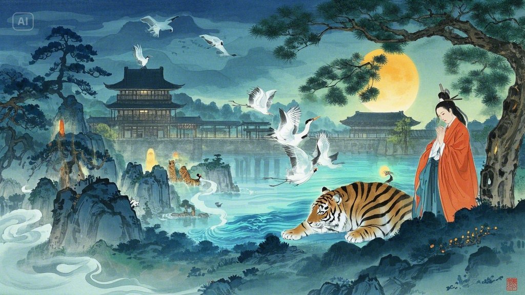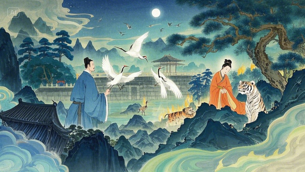 3. 김현, 호랑이 처녀를 감동시키다 (김현감호): (내용) 절세미녀로 변한 호랑이와 사랑에 빠진 김현이 그녀의 희생으로 위기를 넘기는 이야기. (해설) 종족을 초월한 사랑과 희생이라는 낭만적이면서도 비극적인 주제를 다루며, 불교적 인연과 윤회 사상이 엿보이기도 합니다. 인간과 이종(異種) 간의 금기된 사랑과 소통의 가능성을 탐색합니다.