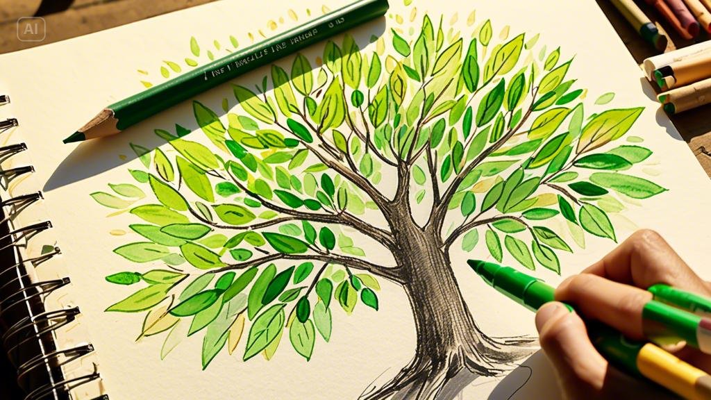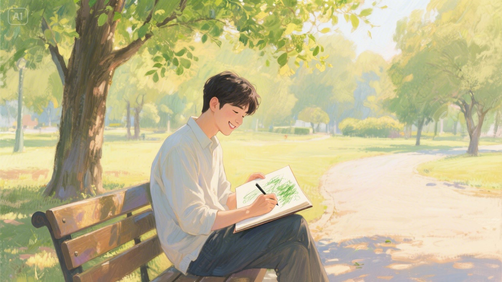 아이가 푸른 잎을 그려준 나무 옆 페이지에, 그는 천천히 연필을 움직이기 시작했다. 햇살을 받아 반짝이는 나뭇잎, 지저귀는 새들, 웃으며 지나가는 사람들. 그의 눈에 비친 세상은 더 이상 잿빛이 아니었다. 어색하고 서툴렀지만, 그의 손끝에서 피어나는