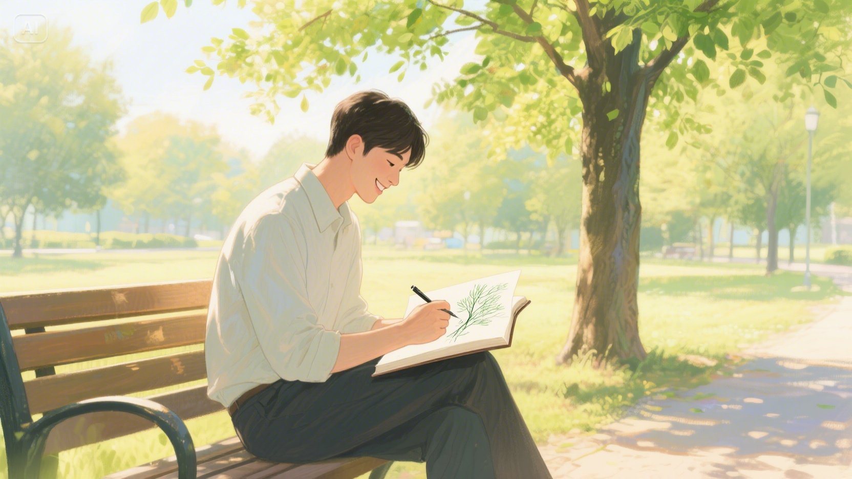 그리고 다시 시선을 스케치북으로 돌렸다. 아이가 그려준 푸른 잎사귀들이 햇살 아래 싱그럽게 반짝이고 있었다. 엉성하고 삐뚤빼뚤했지만, 세상 그 어떤 그림보다 아름답고 완벽하게 느껴졌다. 그는 조심스럽게 스케치북을 덮었다. 가슴 속에서 무언가 따뜻하고 말랑한 것이 차오르는 느낌이었다.