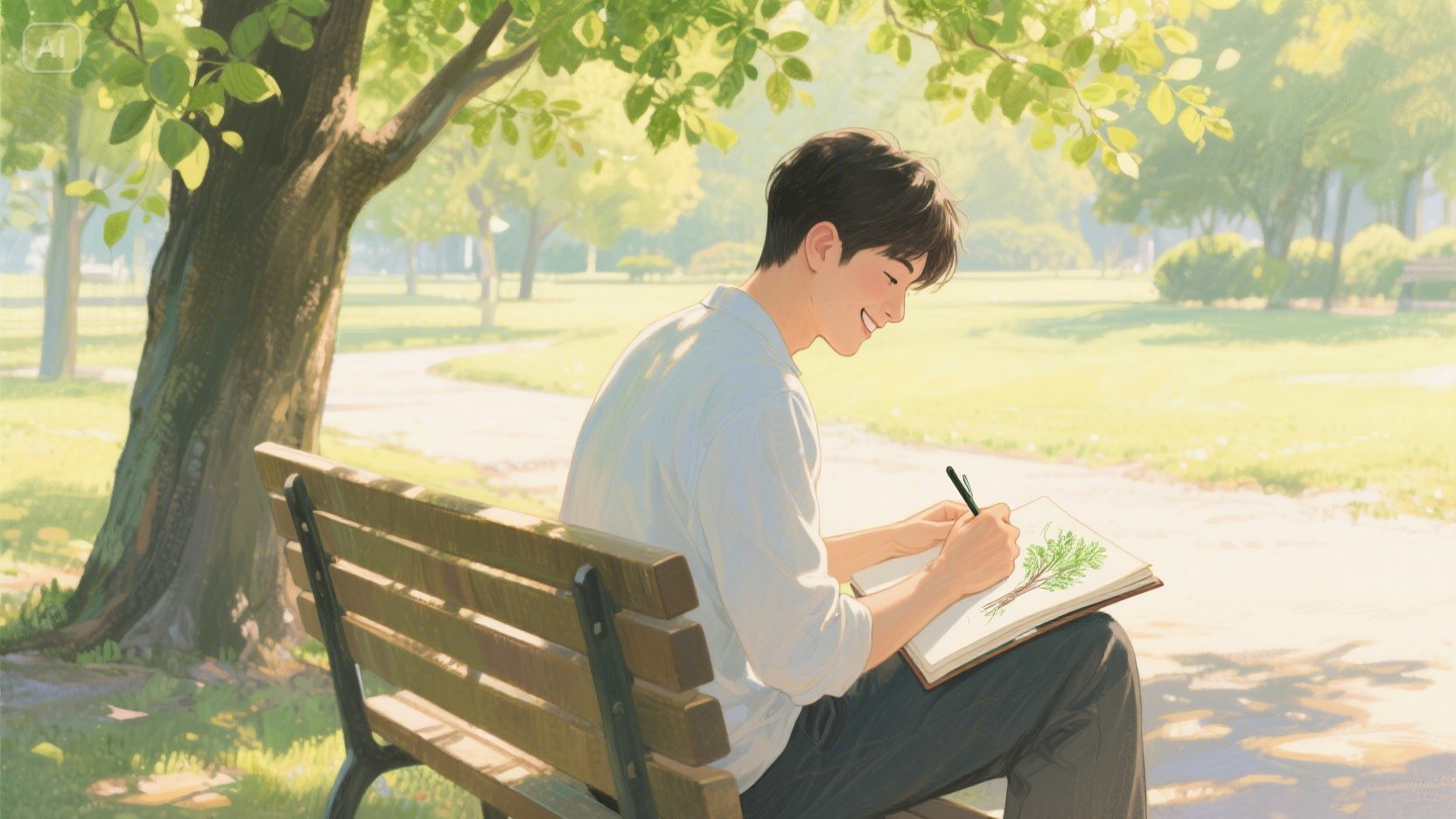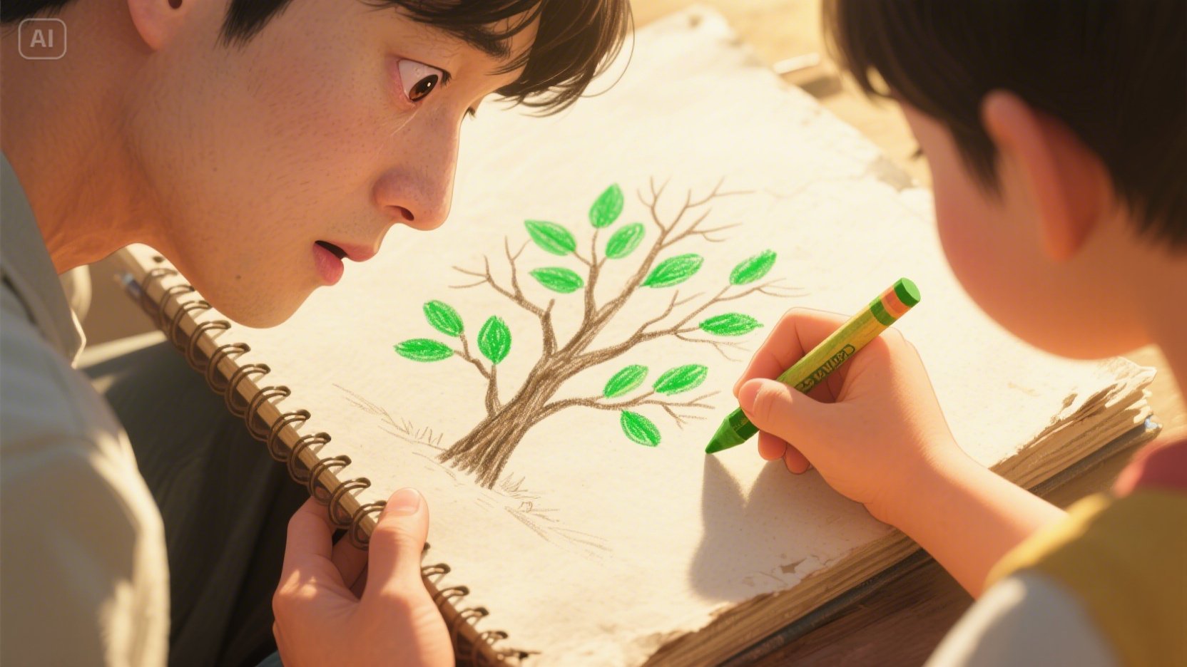 그리고 다시 시선을 스케치북으로 돌렸다. 아이가 그려준 푸른 잎사귀들이 햇살 아래 싱그럽게 반짝이고 있었다. 엉성하고 삐뚤빼뚤했지만, 세상 그 어떤 그림보다 아름답고 완벽하게 느껴졌다. 그는 조심스럽게 스케치북을 덮었다. 가슴 속에서 무언가 따뜻하고 말랑한 것이 차오르는 느낌이었다.