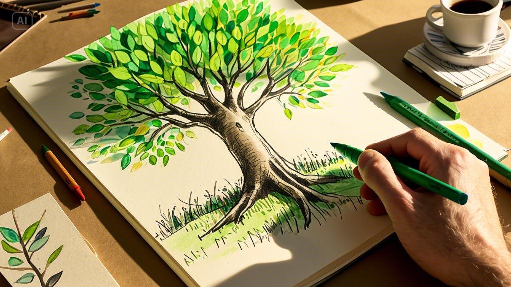 아이가 푸른 잎을 그려준 나무 옆 페이지에, 그는 천천히 연필을 움직이기 시작했다. 햇살을 받아 반짝이는 나뭇잎, 지저귀는 새들, 웃으며 지나가는 사람들. 그의 눈에 비친 세상은 더 이상 잿빛이 아니었다. 어색하고 서툴렀지만, 그의 손끝에서 피어나는