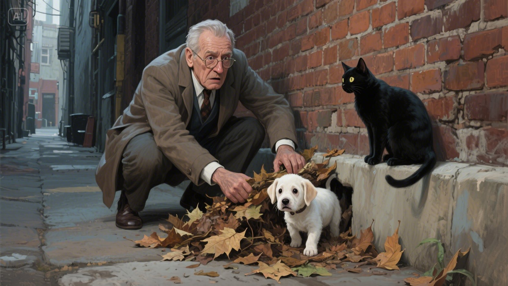 김 반장은 담벼락 쪽으로 다가갔다. 가까이 가 보니, 깜냥이는 담벼락 아래 쌓인 낙엽 더미를 앞발로 헤집으려 안간힘을 쓰고 있었다. 김 반장은 직감적으로 뭔가 있음을 느꼈다. 형사의 본능이랄까, 아니면 그저 고양이에 대한 호기심이랄까. 그는 조심스럽게 낙엽을 치워보았다. 그러자 그 안에서 작고 하얀 강아지 한 마리가 웅크린 채 벌벌 떨고 있는 것이 아닌가.