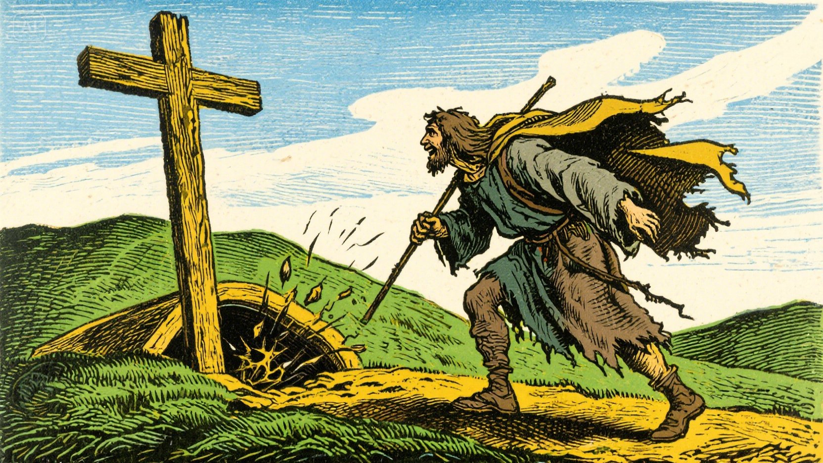 출발하자마자 그는 '절망의 늪'에 빠져 허우적거리고, '세상 지혜자'의 잘못된 꾀임에 넘어가기도 하지만, 결국 '좁은 문'을 통과합니다. 순례길에서 그는 '해석자'의 집에서 여러 영적 교훈을 얻고, '십자가 언덕'에서 마침내 등의 짐이 저절로 벗겨져 굴러 떨어지는 감격적인 구원의 경험을 합니다.
