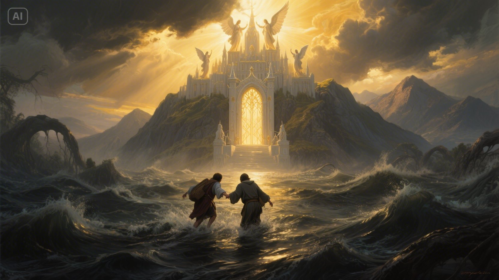 마침내 그들은 '기쁨의 산'에 이르러 천국 도시를 멀리서 조망하고, 목자들로부터 격려와 경고를 듣습니다. 마지막 관문인 '죽음의 강'을 건너는 과정에서 '크리스천'은 큰 두려움에 휩싸이지만, '호프풀'의 격려와 믿음으로 강을 건너 영광스러운 '천국 도시'에 입성하며 영원한 안식을 얻게 됩니다.