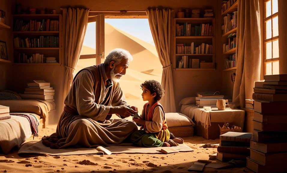 이 기묘한 도서관의 주인은 자이드라는 이름의 노인이었다. 햇볕에 그을린 얼굴에는 깊은 주름이 자리 잡았지만, 그의 눈빛만큼은 밤하늘의 별처럼 총명하게 빛났다. 자이드는 수십 년 전, 사랑하는 아내와 함께 이 길을 지나다 모래폭풍 속에서 그녀를 잃었다. 아내는 생전에 책과 이야기를 세상 무엇보다 사랑했다.