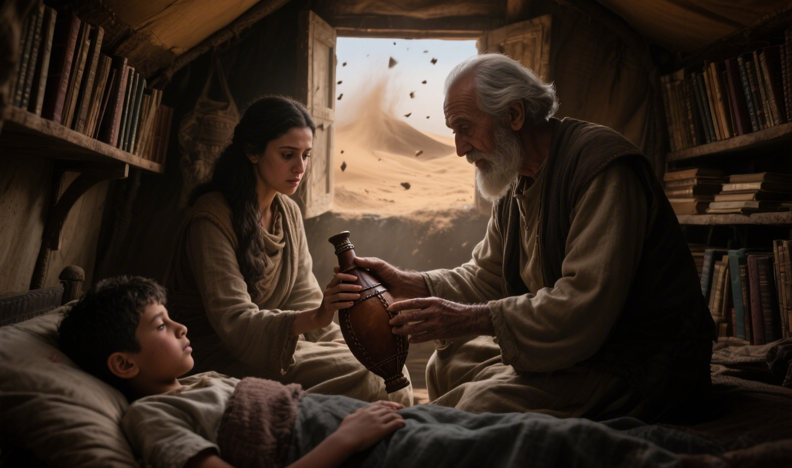그러던 어느 날, 갑작스럽게 거대한 모래폭풍이 불어닥쳤다. 하늘은 순식간에 잿빛으로 변하고, 카라반은 금방이라도 날아갈 듯 세차게 흔들렸다. 모두가 카라반 안으로 몸을 피했지만, 불안감은 쉽게 가시지 않았다. 식량과 물은 점점 바닥을 드러내고 있었다. 그때, 어린 칼리드가 높은 열에 시달리기 시작했다. 모래 먼지가 잔뜩 들어간 눈은 붉게 충혈되었고, 숨소리마저 거칠어졌다.