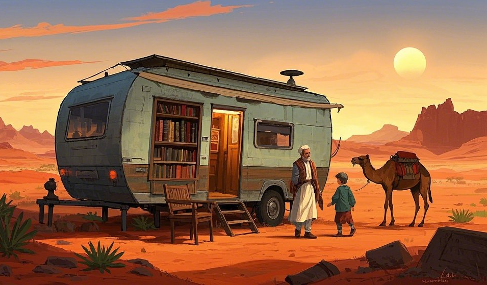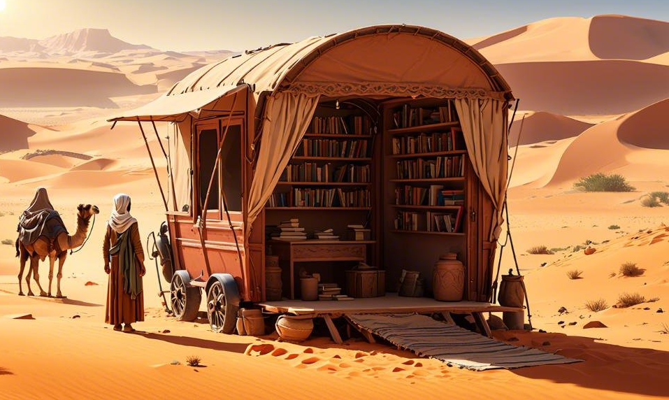 숨 막히는 열기가 아지랑이처럼 피어오르는 붉은 모래의 바다. 끝없이 펼쳐진 사막 한가운데, 마치 신기루처럼 낡은 카라반 한 대가 덩그러니 서 있었다. 뜨거운 태양 아래 빛바랜 페인트는 세월의 흔적을 고스란히 보여주었지만, 그 옆에 세워진 작은 나무 팻말에는 정성스럽게 새겨진 글씨가 눈에 띄었다. ‘별 헤는 도서관’.