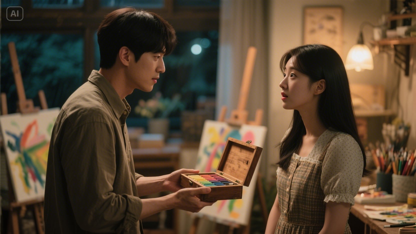 하늘이는 동그래진 눈으로 민준과 상자를 번갈아 보았다. 상자 안에는 민준의 젊은 날의 열정처럼, 다채로운 색상의 파스텔과 색연필이 가지런히 누워 있었다. 하늘이는 잠시 망설이는 듯했지만, 이내 민준의 진심 어린 눈빛을 읽고 조심스럽게 손을 내밀었다.
