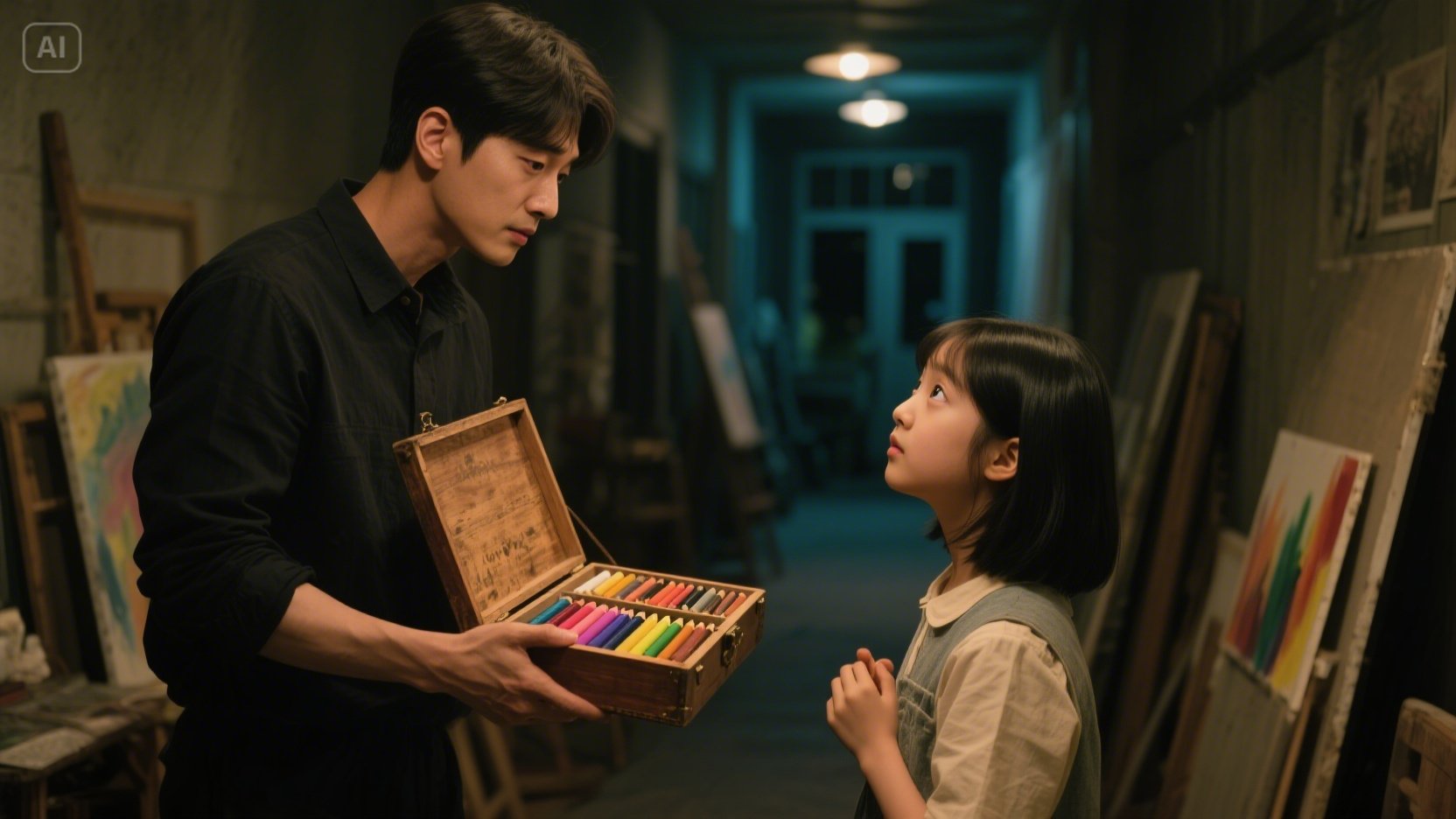 하늘이는 동그래진 눈으로 민준과 상자를 번갈아 보았다. 상자 안에는 민준의 젊은 날의 열정처럼, 다채로운 색상의 파스텔과 색연필이 가지런히 누워 있었다. 하늘이는 잠시 망설이는 듯했지만, 이내 민준의 진심 어린 눈빛을 읽고 조심스럽게 손을 내밀었다.