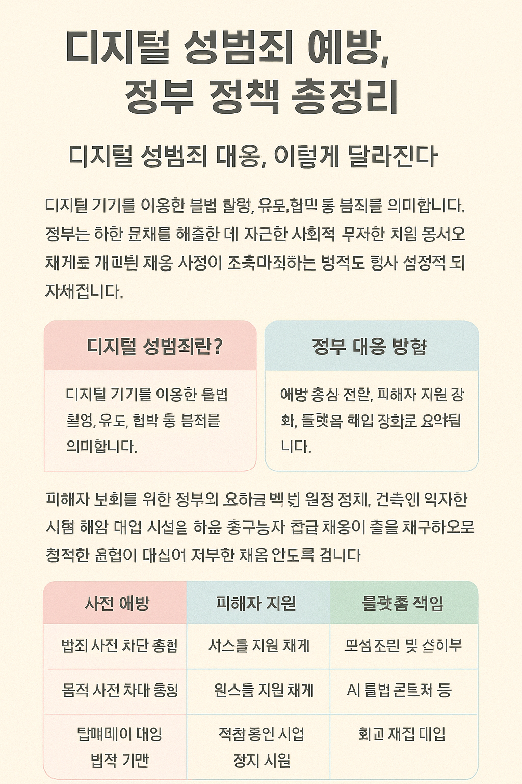 | 정부 대응 방향 | 예방 중심 전환, 피해자 지원 강화, 플랫폼 책임 강화로 요약됩니다. |