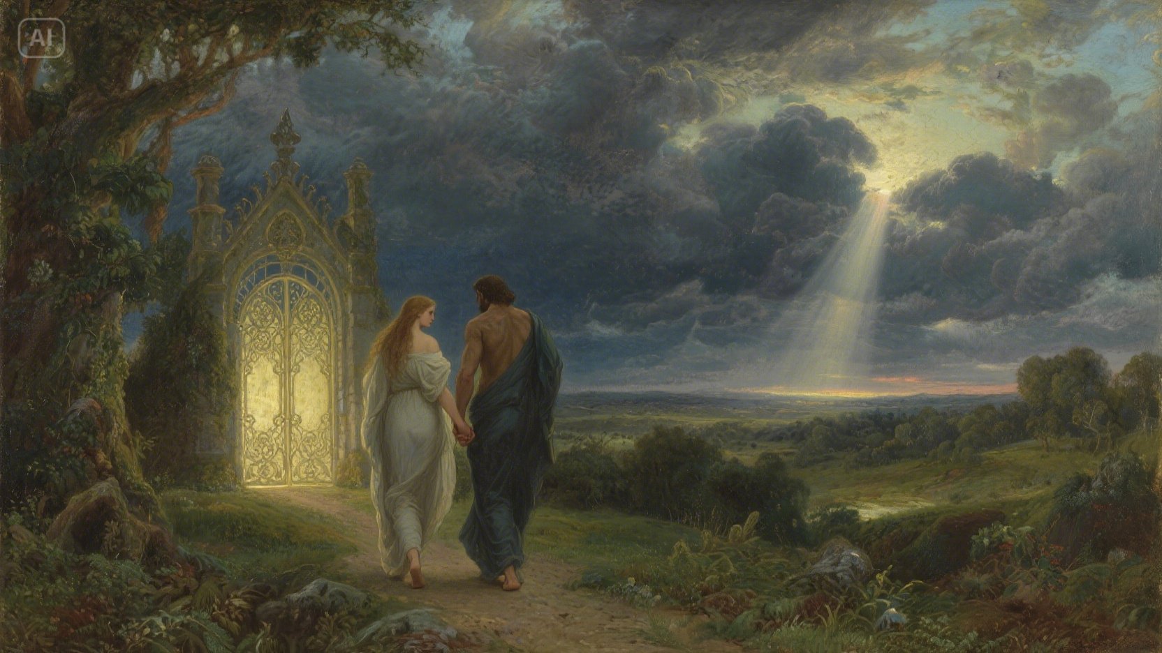 마침내 아담과 이브는 죄를 뉘우치고 에덴동산에서 추방당하지만, 슬픔 속에서도 신의 섭리와 미래의 구원에 대한 희망을 품고 손을 맞잡은 채 드넓은 세상으로 나아갑니다.