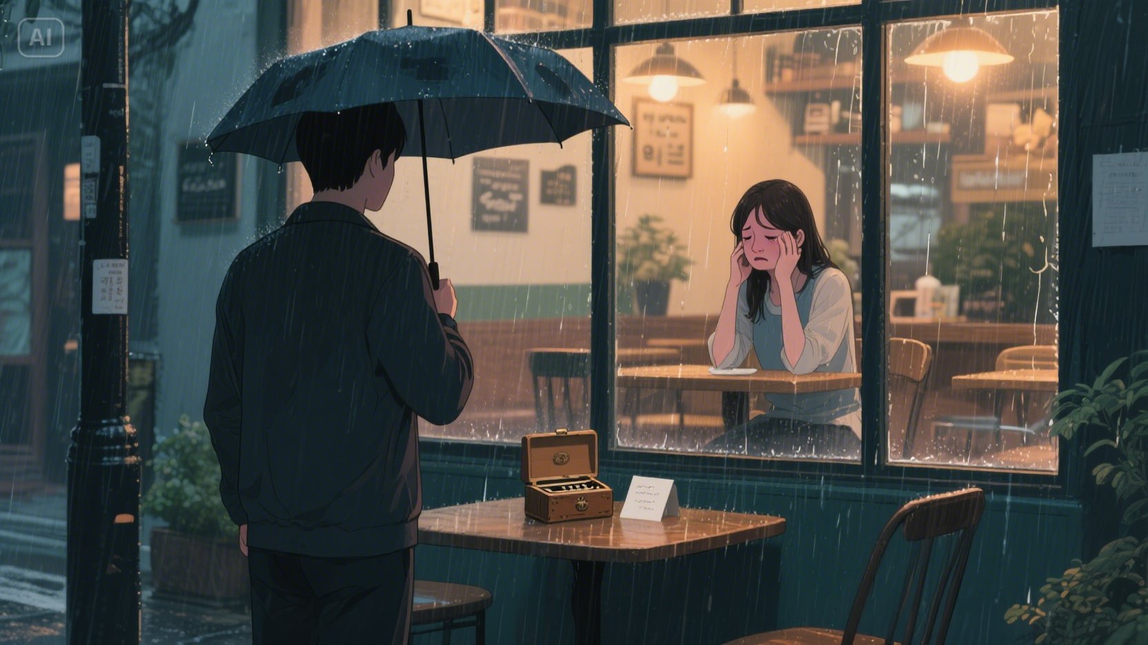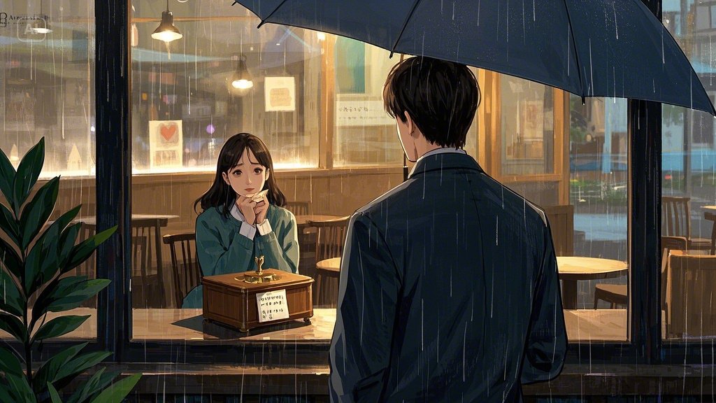 며칠 후, 민준은 수현의 회사 근처 카페에서 그녀를 우연히 발견했다. 그녀는 창가에 홀로 앉아 낡은 오르골을 앞에 두고 하염없이 눈물을 흘리고 있었다. 민준은 가슴이 아팠다. 그녀의 혼란과 슬픔, 그리고 흔들리는 마음이 고스란히 전해져 오는 듯했다.