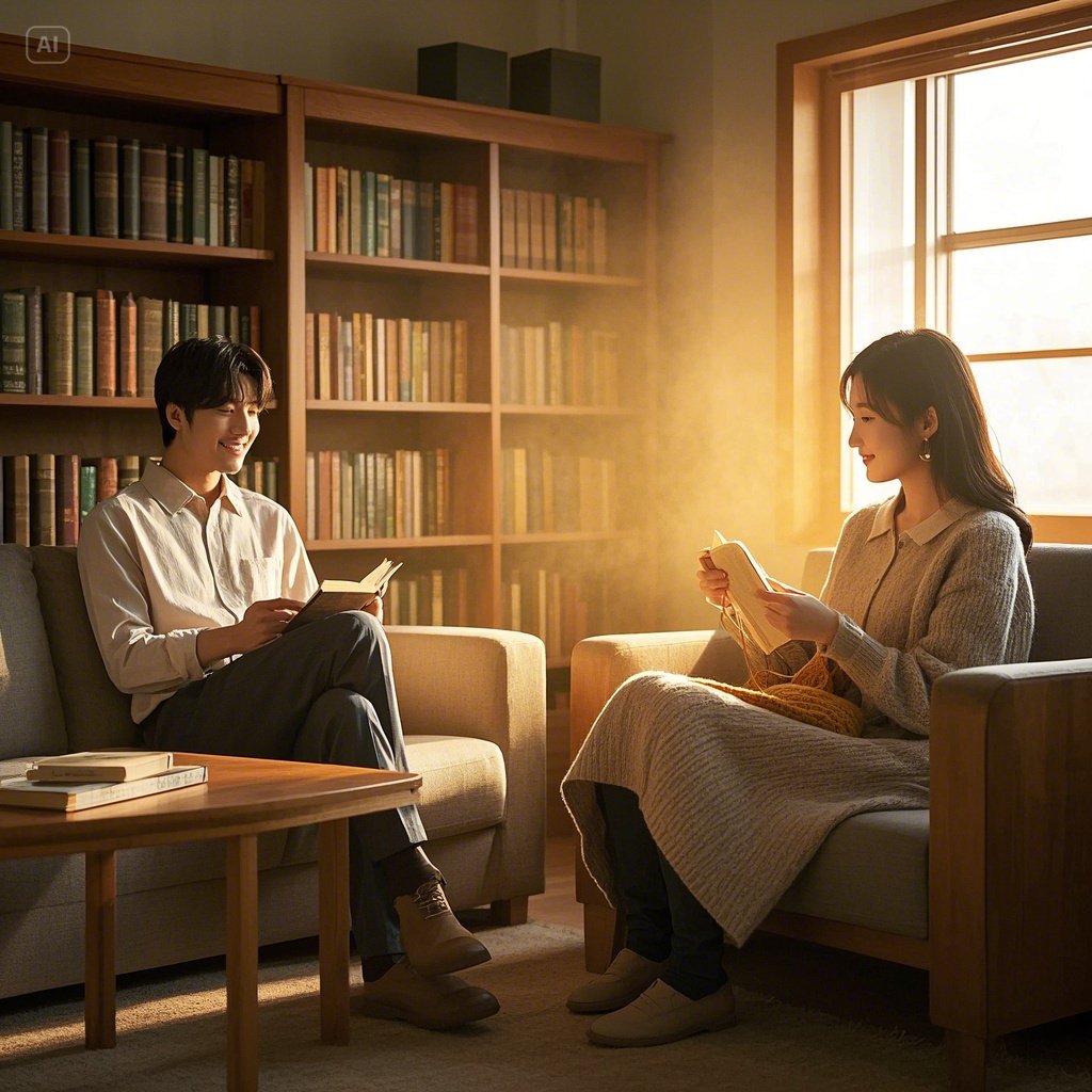 나는 책을 내려놓고 그녀를 향해 웃었다. 지수의 눈가에 잔잔한 미소가 어렸다.