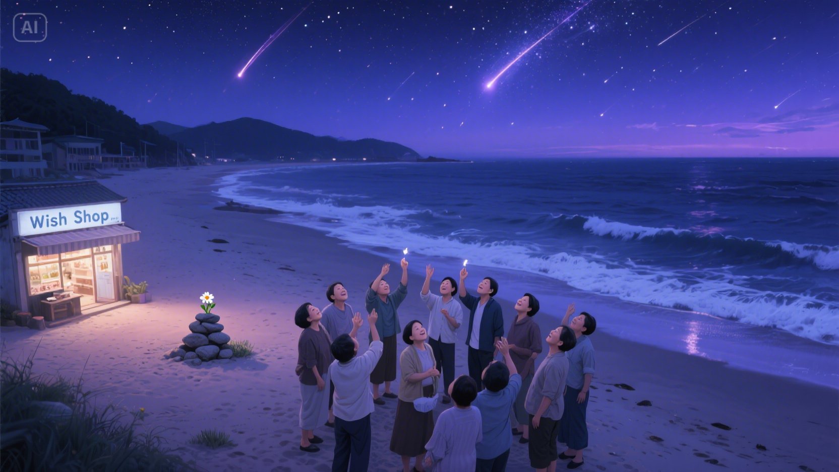 하지만 잔별리 사람들은 슬퍼하지 않았다. 윤슬 할머니는 사라졌지만, 그녀가 남기고 간 가장 소중한 선물, ‘타인을 위한 진심 어린 소원’의 가치는 마을 사람들 마음속에 영원히 살아 숨 쉬고 있었기 때문이다. 그 후로도 잔별리 해변에는 밤마다 별들이 쏟아졌고, 사람들은 별똥별을 보며 서로의 행복을 빌어주는 따뜻한 전통을 이어갔다. 마치 윤슬 할머니의 잔잔한 미소가 밤하늘 가득 번지는 것 같았다.
