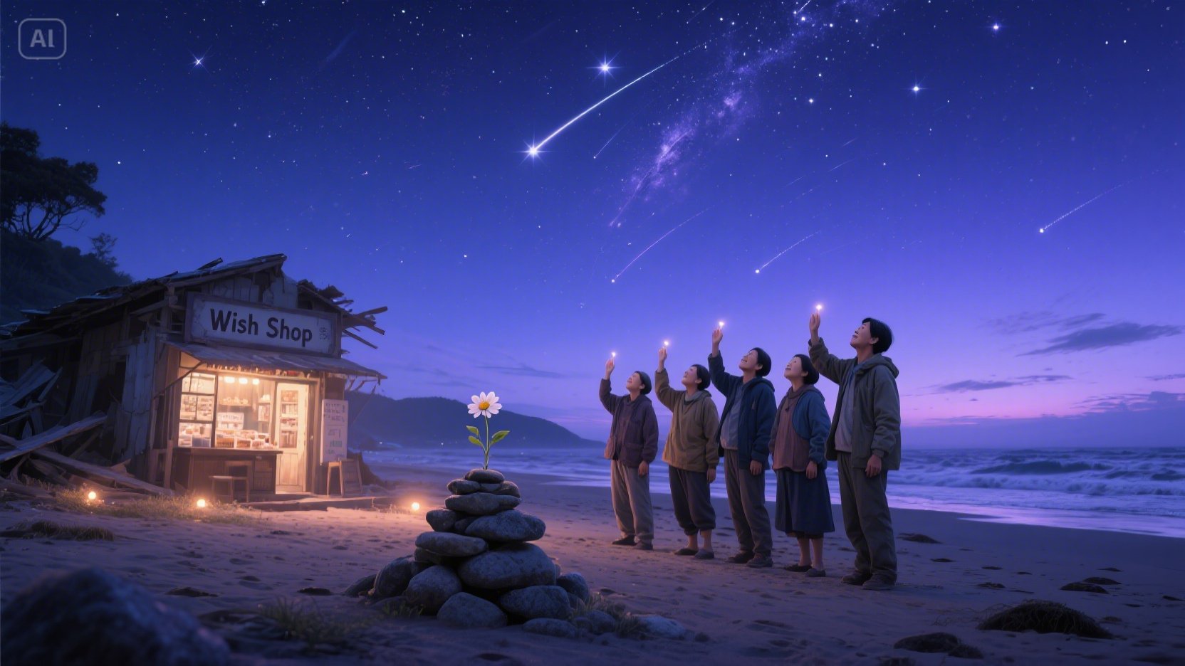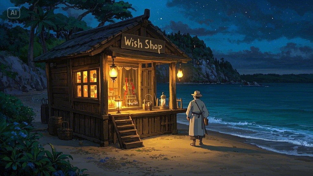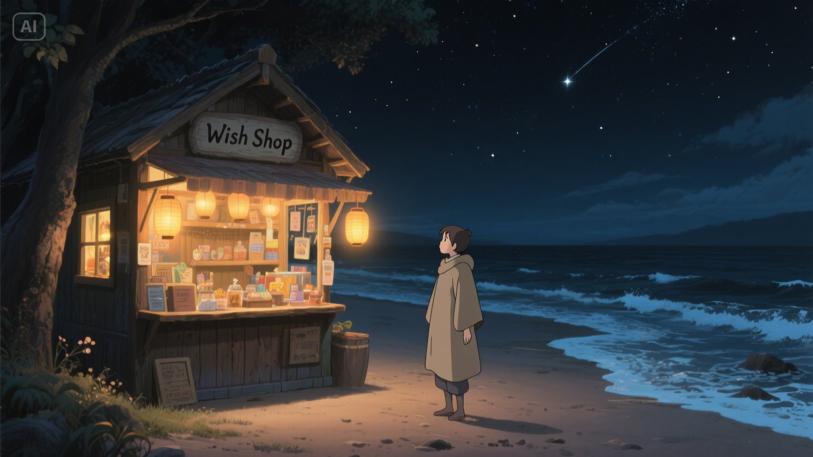 밤의 장막이 잔별리 해변을 포근히 감싸 안을 때면, 파도 소리만이 낮게 속삭이는 그곳에 외딴 등불 하나가 외로이 깜빡였다. ‘소원 가게’. 간판이라고 하기엔 너무나 소박한 나무 조각에 투박하게 새겨진 글씨였다.