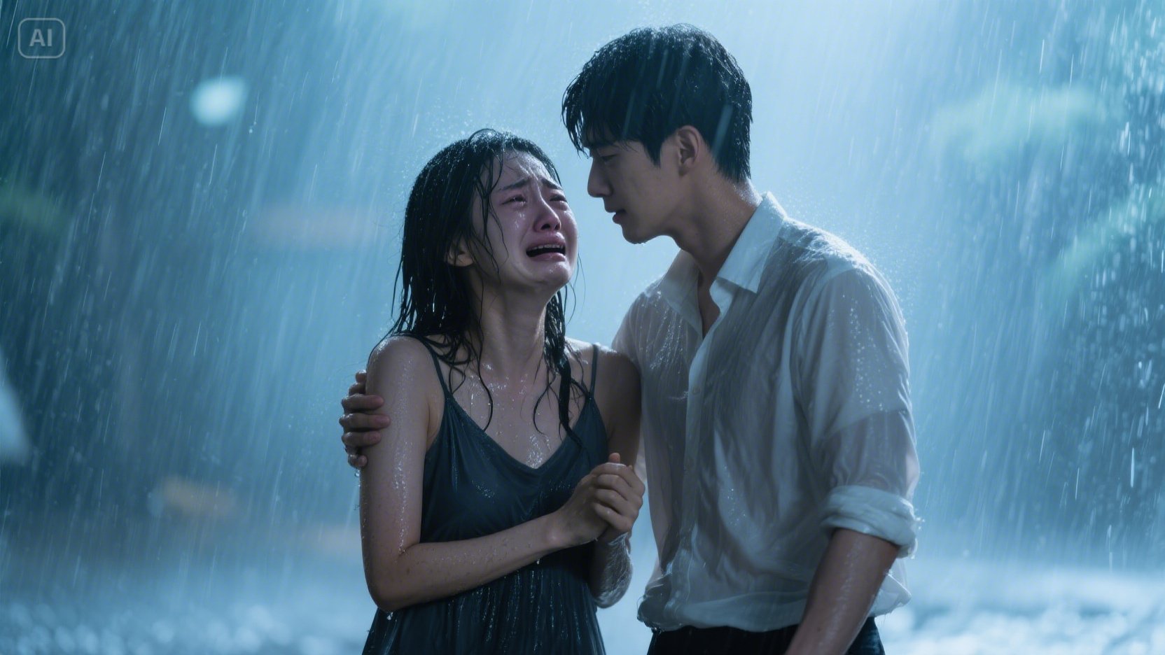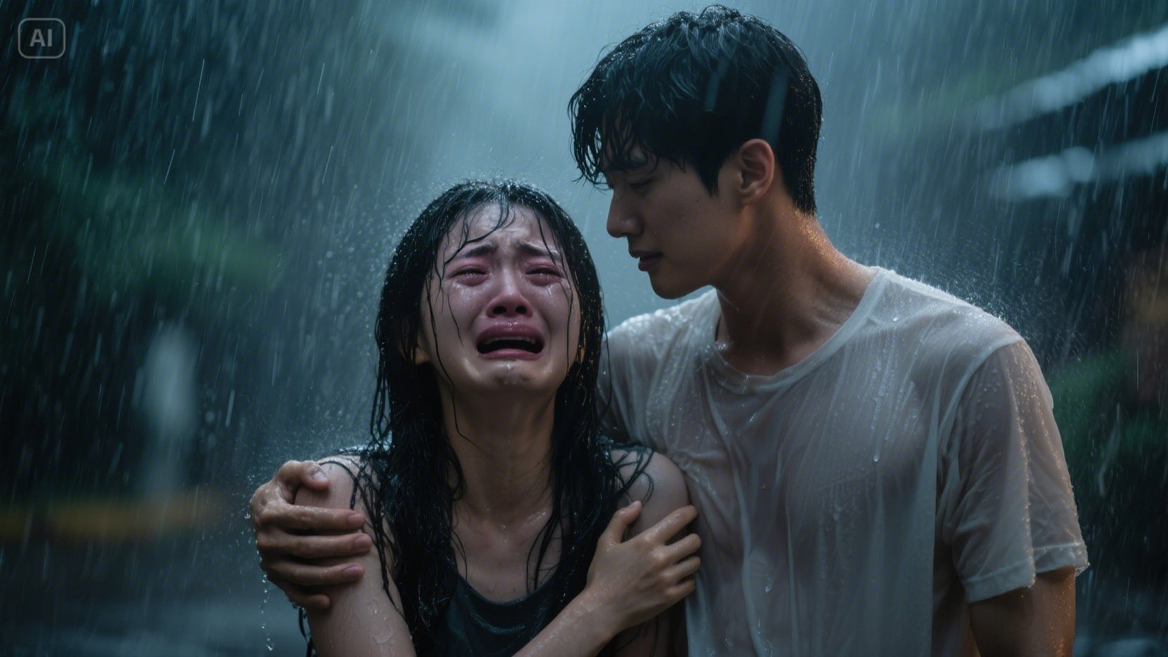 그때였다. 갑자기 세찬 바람과 함께 폭우가 쏟아지기 시작했다. 근처에는 비를 피할 만한 곳도 마땅치 않았다. 순식간에 두 사람은 흠뻑 젖어버렸다. 당황한 수아와 달리, 지훈은 젖은 머리를 아무렇게나 쓸어 넘기며 허탈하게 웃었다.