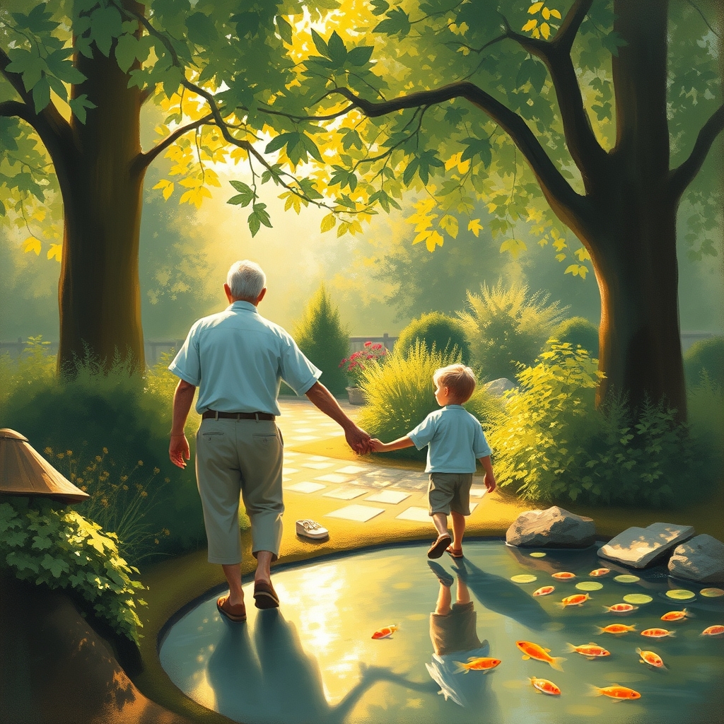 윤호는 할아버지의 손을 꼭 잡고 정원을 천천히 거닐었다. 그리고 두 사람이 향한 곳은 집 앞의 작은 연못이었다. 연못 위에는 나뭇잎이 둥둥 떠 있었고, 그 사이로 작은 물고기들이 헤엄치고 있었다.