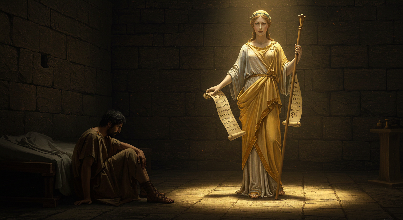 책은 감옥에 갇힌 보에티우스가 자신의 불행한 처지를 비탄하며 시를 짓는 장면으로 시작됩니다. 이때, 위엄 있고 아름다운 여인, '철학'이 그의 앞에 나타납니다. 그녀는 보에티우스가 앓는 병이 '자기 자신을 잊어버린 것'이라 진단하고, 그를 치유하기 위한 지적 대화를 시작합니다.