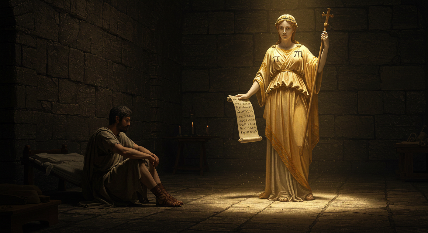 책은 감옥에 갇힌 보에티우스가 자신의 불행한 처지를 비탄하며 시를 짓는 장면으로 시작됩니다. 이때, 위엄 있고 아름다운 여인, '철학'이 그의 앞에 나타납니다. 그녀는 보에티우스가 앓는 병이 '자기 자신을 잊어버린 것'이라 진단하고, 그를 치유하기 위한 지적 대화를 시작합니다.