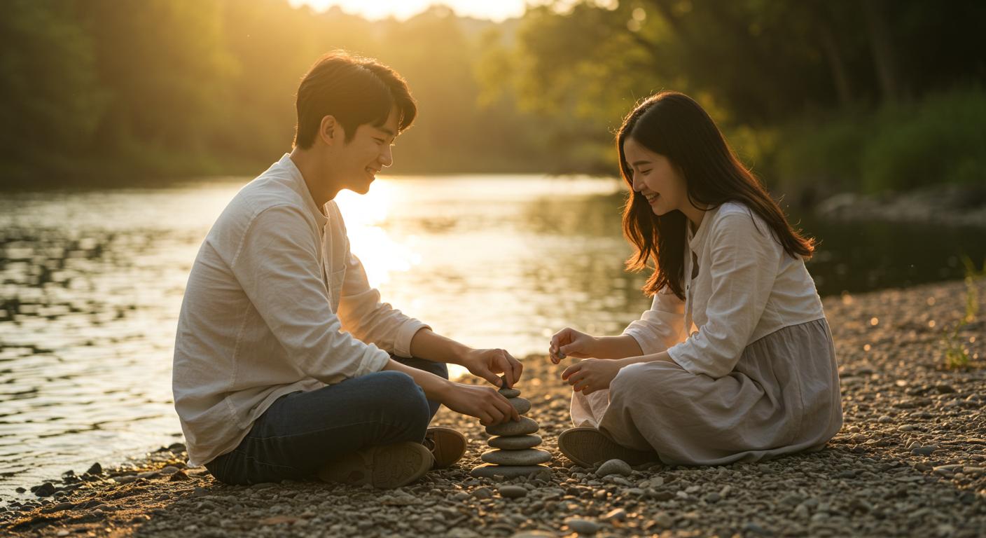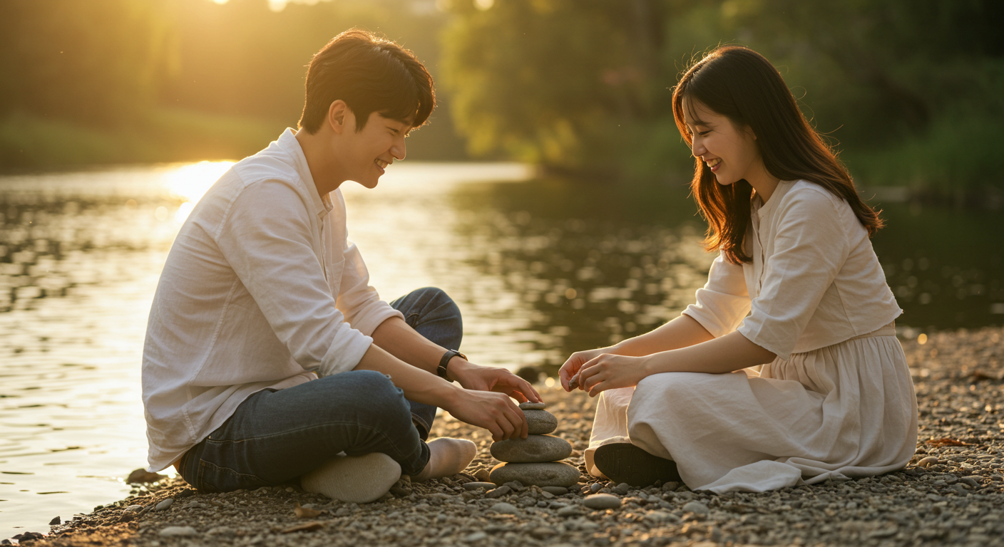 그녀는 돌을 내려놓고 한참 동안 강물을 바라보다가, 이내 조용히 자리를 떴다. 민준은 심장이 세차게 뛰는 것을 느끼며 그녀가 있던 자리로 다가갔다. 그곳에는 ‘숨’이라는 글자가 새겨진 조약돌이 놓여 있었다.