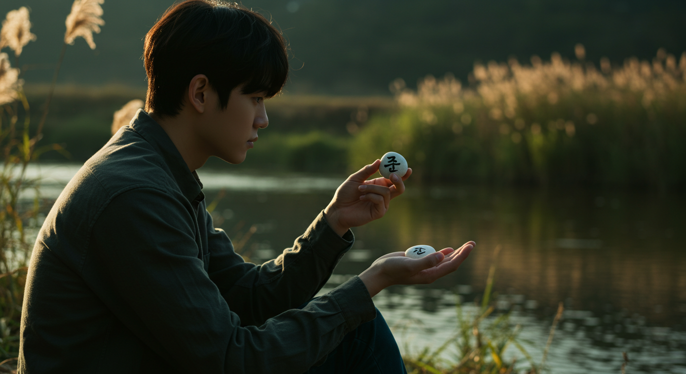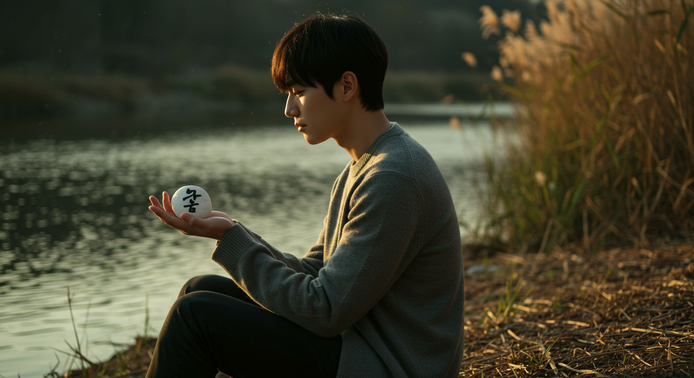 그러다 문득, 발치에 놓인 유난히 희고 매끄러운 조약돌 하나에 시선이 멎었다. 손에 쥐자 기분 좋은 무게감과 함께 서늘한 감촉이 전해졌다. 그런데 돌의 표면에는 무언가 새겨져 있었다. 먹물로 쓴 듯, 단정하면서도 힘 있는 필체의 한자 하나.