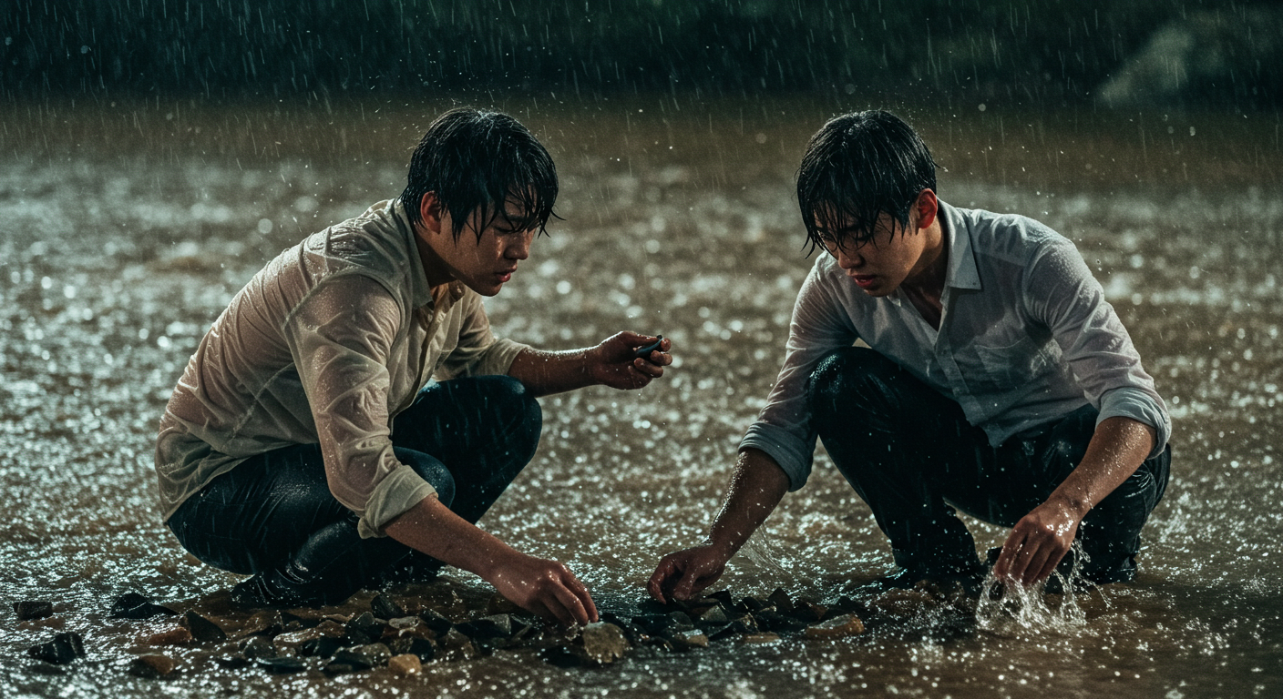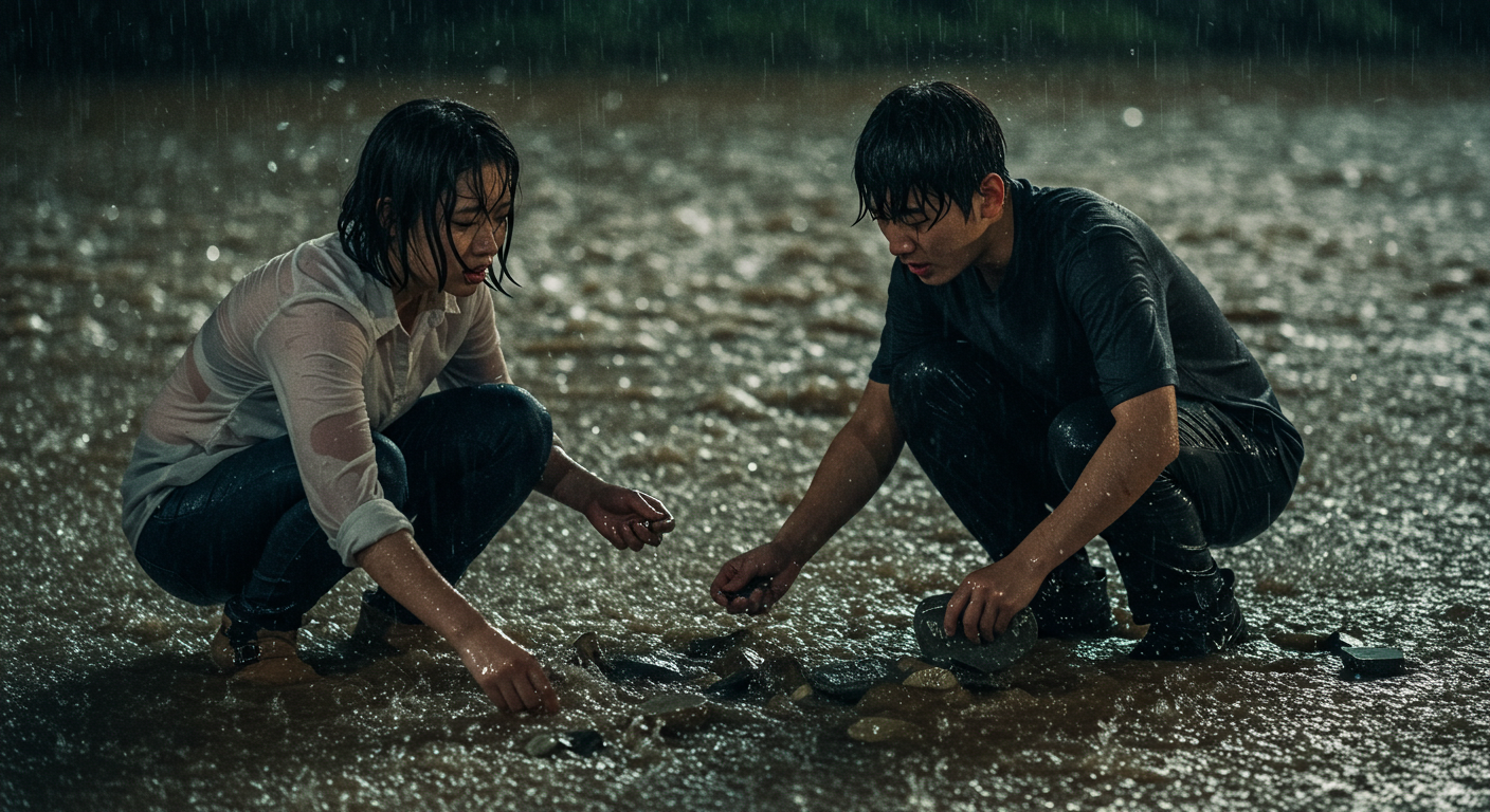 그녀의 작은 속삭임은 빗소리에 묻혔지만 민준의 가슴에는 천둥처럼 울렸다. 그는 더 이상 아무것도 묻지 않고 강물로 뛰어들었다. 차가운 물살이 다리를 휘감았지만, 그는 손을 뻗어 하나라도 더 건져내려 애썼다. 그녀도 그런 민준을 보며 함께 돌을 건지기 시작했다. 한참 동안 두 사람은 비에 젖은 생쥐 꼴이 되어, 말없이 돌멩이만 건져 올렸다.