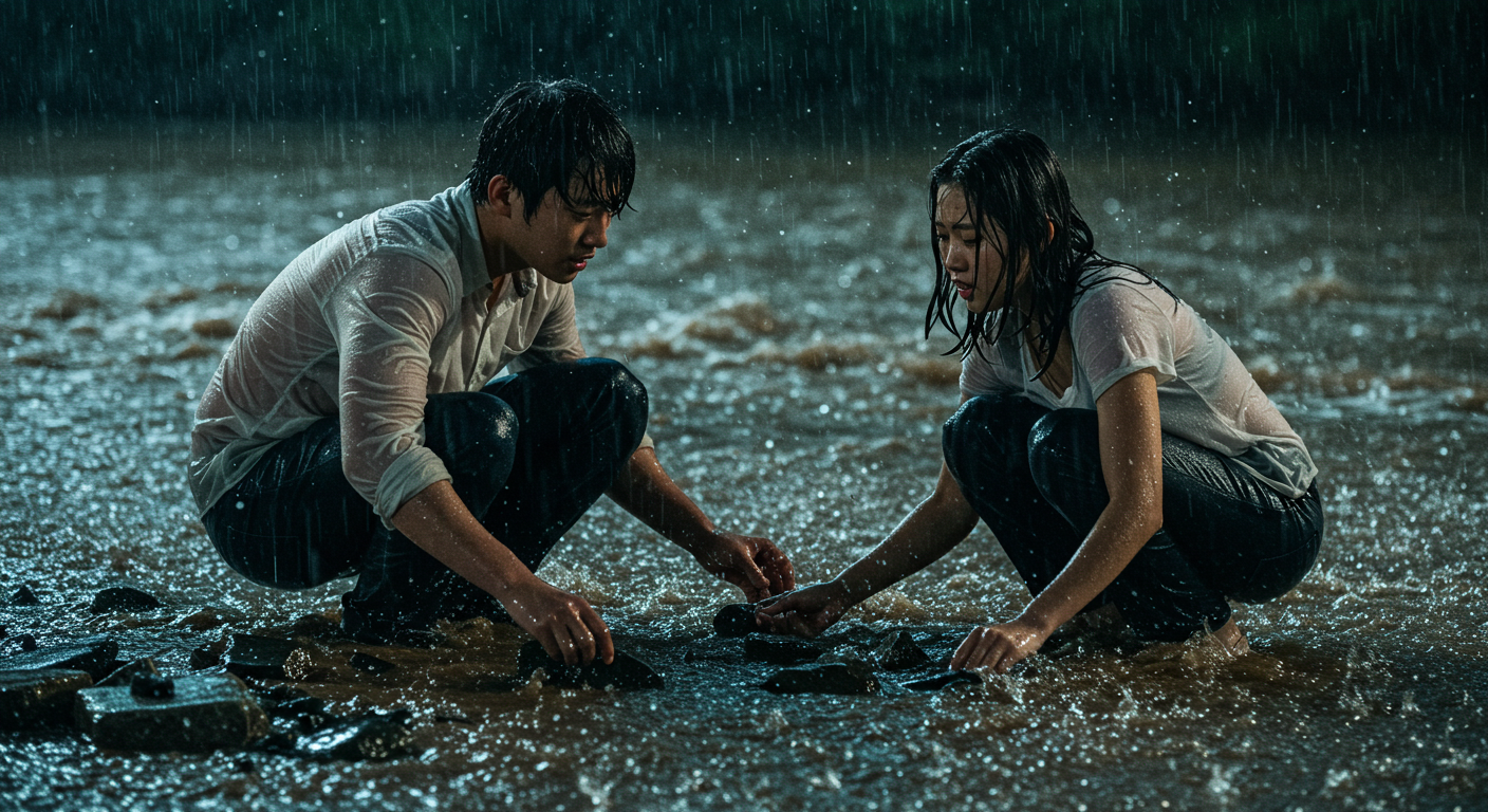 그녀의 작은 속삭임은 빗소리에 묻혔지만 민준의 가슴에는 천둥처럼 울렸다. 그는 더 이상 아무것도 묻지 않고 강물로 뛰어들었다. 차가운 물살이 다리를 휘감았지만, 그는 손을 뻗어 하나라도 더 건져내려 애썼다. 그녀도 그런 민준을 보며 함께 돌을 건지기 시작했다. 한참 동안 두 사람은 비에 젖은 생쥐 꼴이 되어, 말없이 돌멩이만 건져 올렸다.