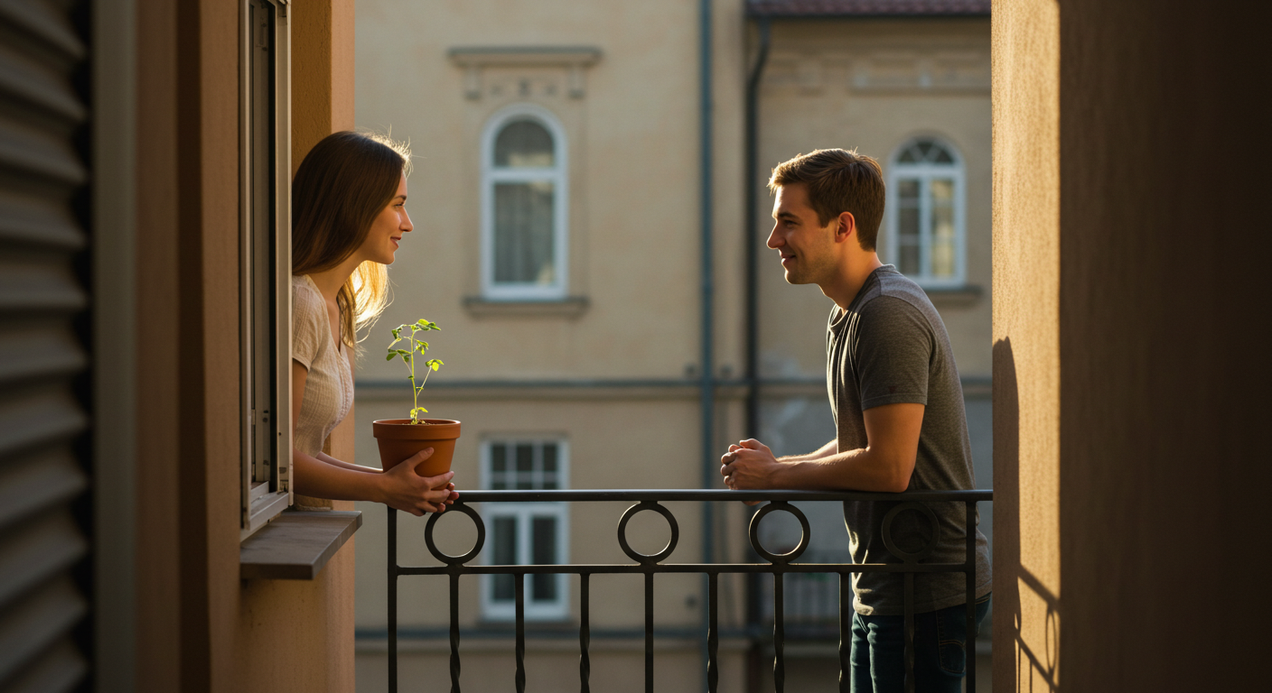 소희가 쪽지를 들고 창가로 다가선 순간, 맞은편 302호 발코니 문이 열리고 그가 나왔다. 두 사람은 처음으로 서로를 마주 보았다. 그는 수줍게 웃으며 가볍게 고개를 숙였고, 소희의 눈에서는 뜨거운 눈물이 흘러내렸다.