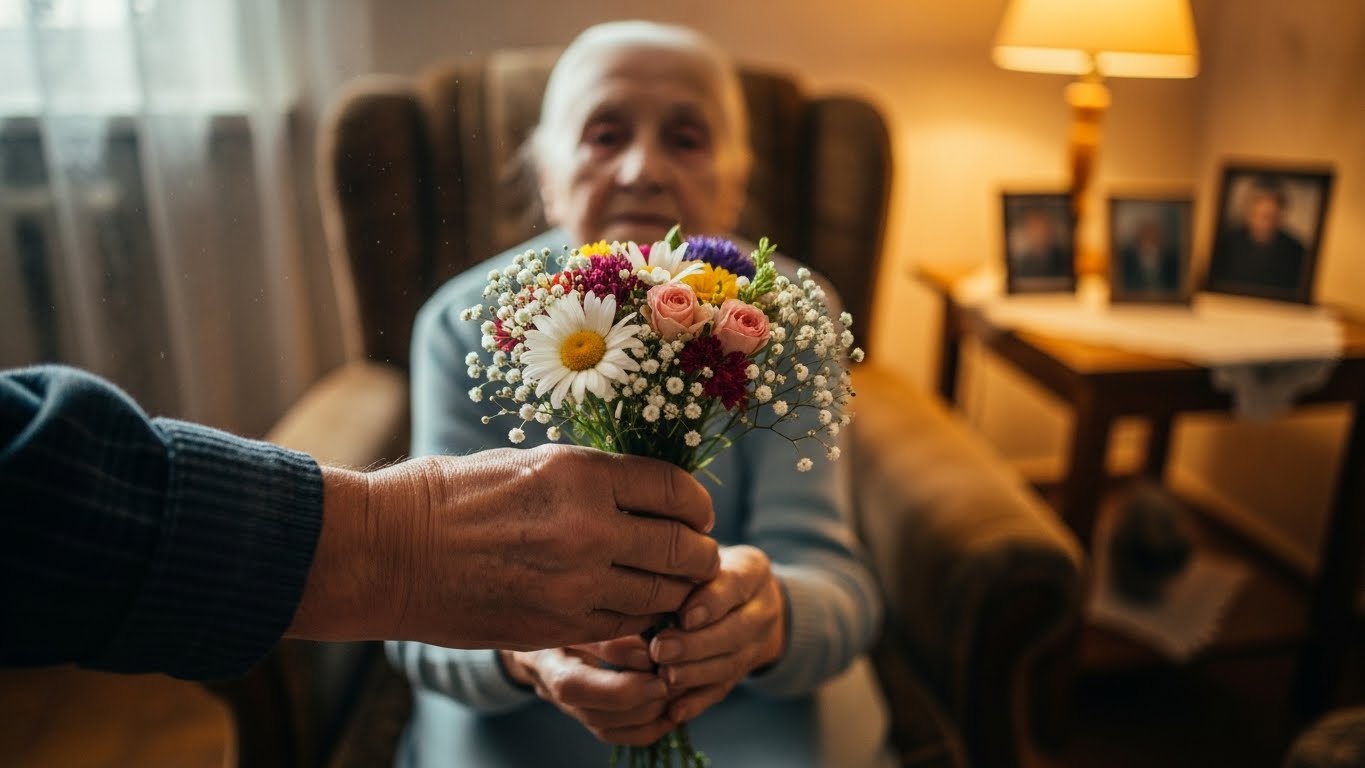 할아버지는 아내의 손에 꽃다발을 쥐여주었다. 할머니는 무표정하게 꽃을 내려다보더니, 아주 천천히, 입가에 희미한 미소를 피워 올렸다. 그 순간, 할아버지의 깊게 팬 주름 사이로 안도와 행복이 스며 나왔다.