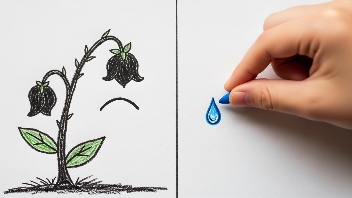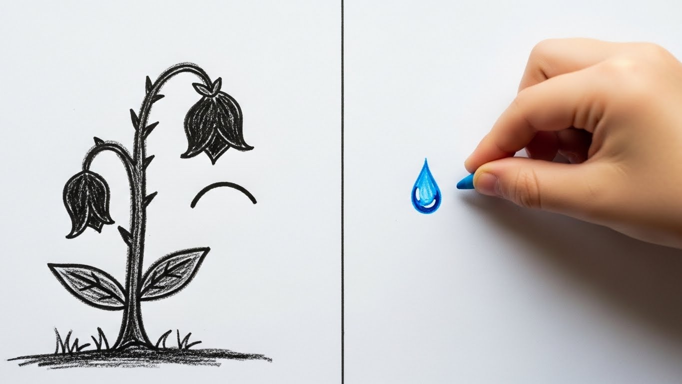 그때였다. 미동도 없던 서진이의 시선이 그림에 닿았다. 아이는 한참 동안 시든 화분 그림을 내려다보더니, 아주 천천히, 떨리는 손으로 파란색 크레파스를 집었다. 굳은 손가락으로 크레파스를 쥐는 것은 힘겨워 보였다. 아이는 낑낑거리며, 유월이 그린 화분 옆에 작은 물방울 하나를 톡, 하고 그렸다.
