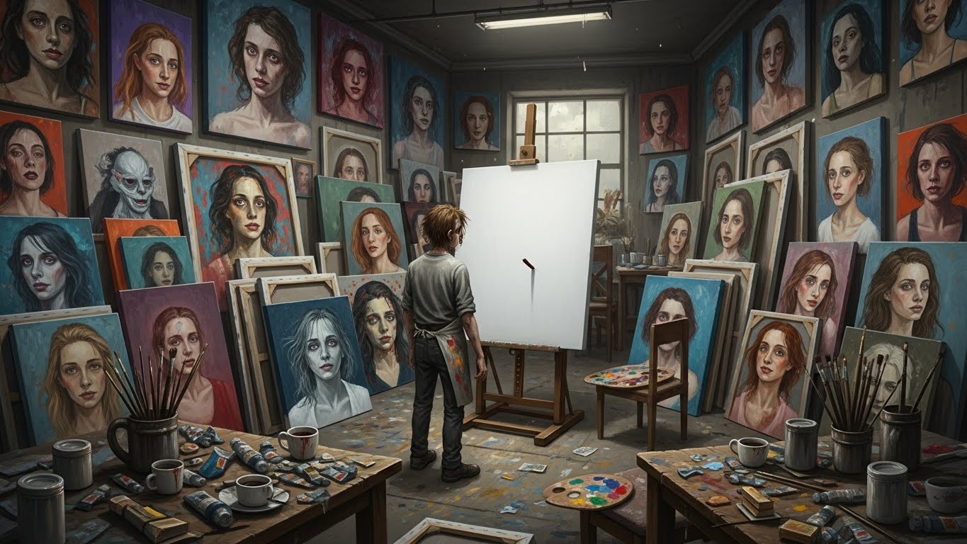 개인전을 며칠 앞둔 어느 밤, 선우는 슬럼프의 절벽 끝에 서 있었다. 새로 펼친 거대한 캔버스 앞에서 몇 시간째 붓을 들지 못했다. 또 그 얼굴을 그려야 한다는 사실이 질식할 듯한 압박감으로 다가왔다.