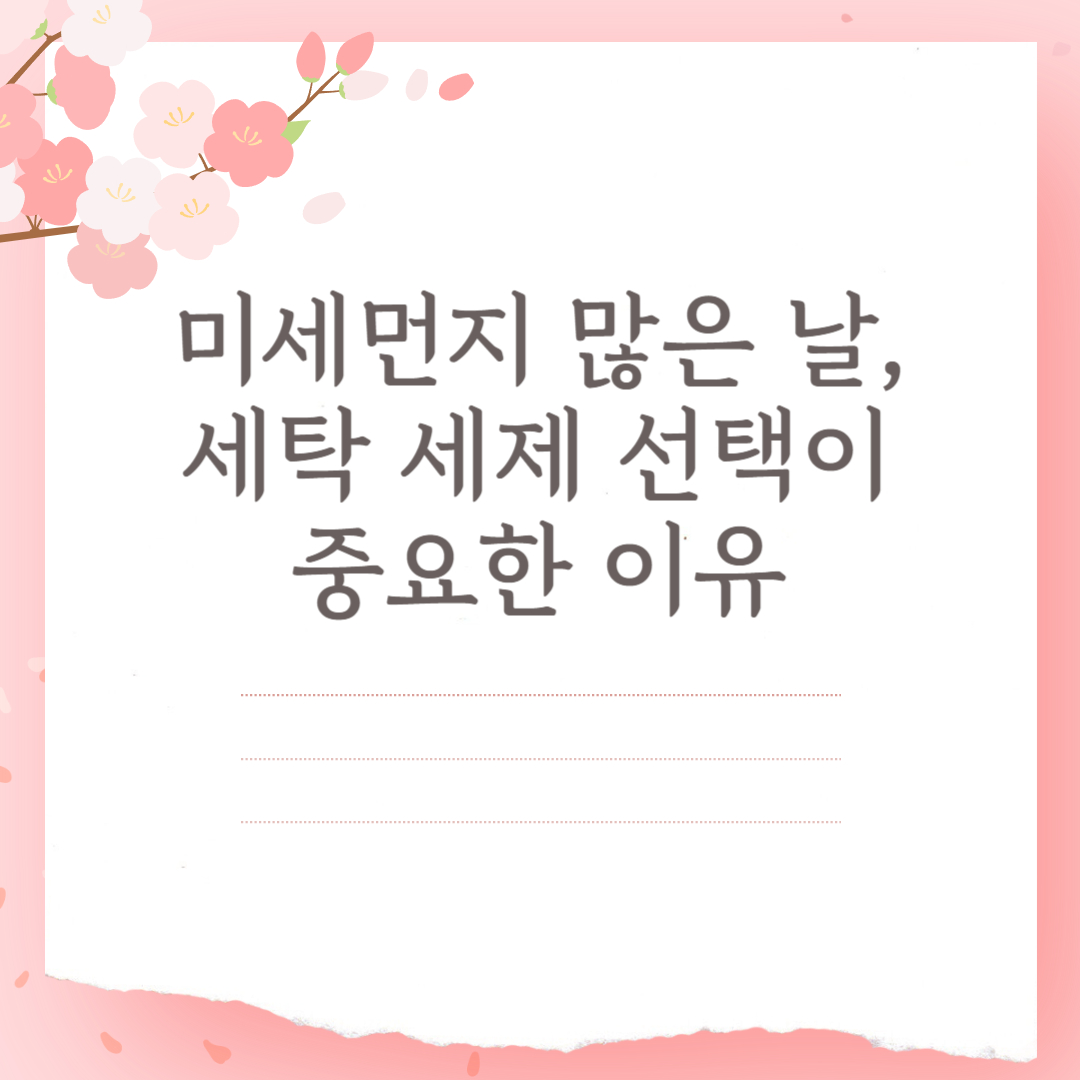 미세먼지가 많은 날에는 단순히 옷을 세탁하는 것만으로는 충분하지 않습니다. 미세먼지 제거 효과가 있는 세제를 사용하고, 올바른 세탁 방법을 적용하는 것이 중요합니다. 정전기 방지 기능이 있는 세제와 세탁 후 건조기 활용을 통해 미세먼지로부터 건강을 지키세요!