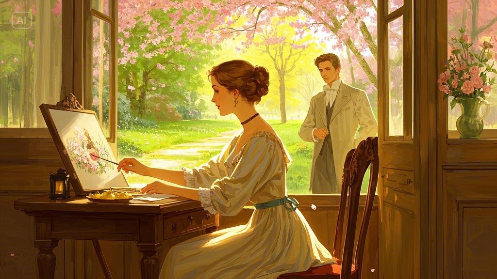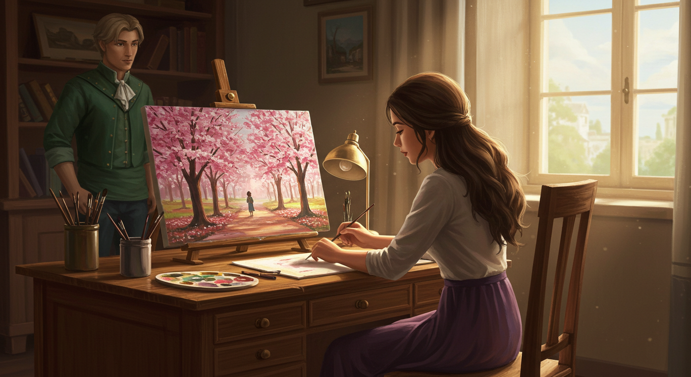 어느 날, 그녀는 어머니의 편지와 일기에서 영감을 받아 작은 그림을 그리기 시작했다. 그녀는 색을 고르고 붓을 들어, 어머니가 좋아했던 벚꽃길을 그렸다. 그 길을 따라 걸으며 어머니와 나누었던 순간들이 하나둘 떠올랐다. 붓이 캔버스를 스칠 때마다, 마치 그녀의 마음속 깊은 감정이 하나씩 풀려 나가는 듯했다.